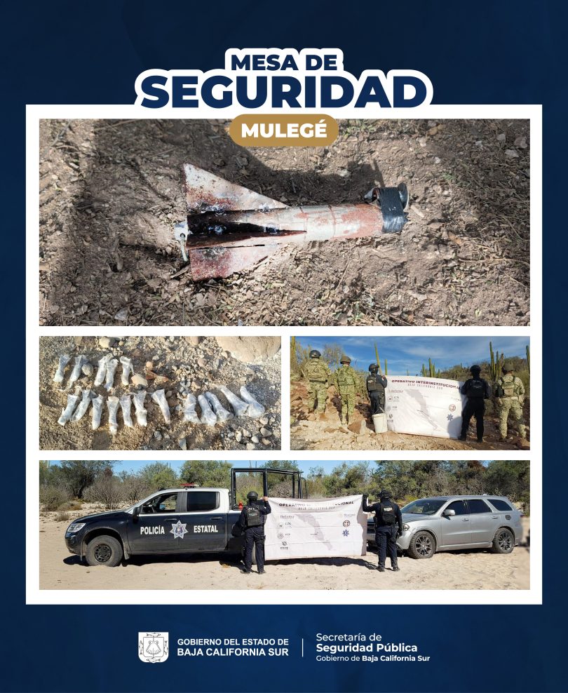 Como resultado de las acciones de prevención y vigilancia que se despliegan en el municipio de Mulegé para garantizar la paz y la tranquilidad, la Mesa Estatal de Seguridad informa que la tarde del lunes 23 de febrero, corporaciones de los tres órdenes de gobierno llevaron a cabo labores operativas que derivaron en el aseguramiento de un vehículo con reporte de robo, posibles sustancias ilícitas, material balístico y la localización de artefactos con características de explosivos.