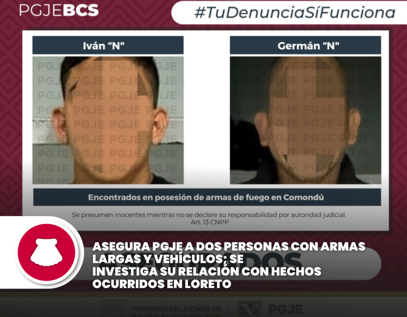 Como resultado de los operativos de la Mesa de Seguridad en Loreto y Comondú, Agentes de Investigación Criminal de la Procuraduría General de Justicia del Estado (PGJE) aseguraron a dos hombres, tres armas largas tipo “cuerno de chivo” con cargadores y cartuchos útiles, dos vehículos y equipo táctico, la tarde del jueves 20 de noviembre, en el tramo carretero Ciudad Constitución–San Carlos.