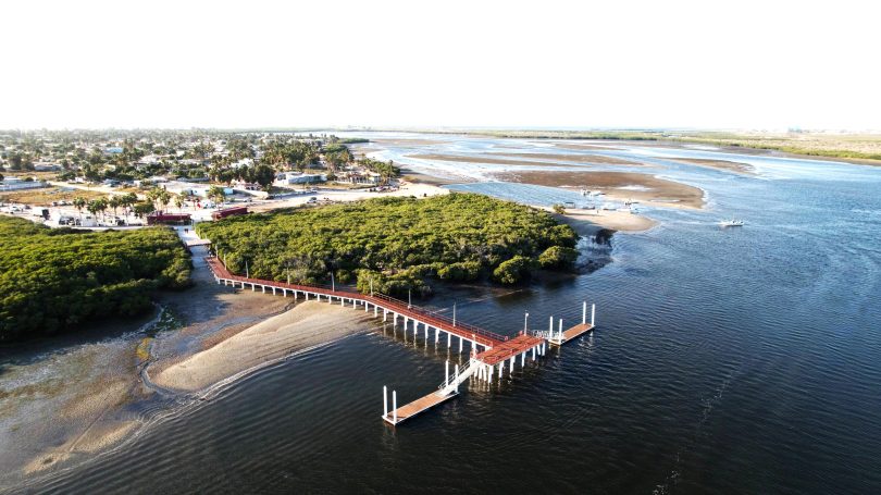 La reconstrucción incluyó pilotes encamisados de concreto, pasarela de acceso de 97 metros, plataforma de embarque, estructura metálica reforzada, barandales de polímero de fibra de vidrio, 16 luminarias y accesos seguros que garantizan la operación eficiente y segura de embarcaciones turísticas y pesqueras.