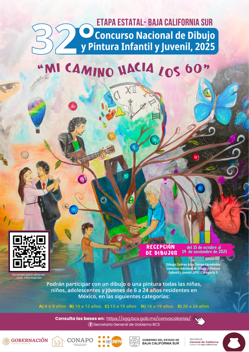 Como parte de la coordinación con el Gobierno de México, el Gobierno del Estado a través de la Secretaría General de Gobierno, invita a niñas, niños, adolescentes y jóvenes, de 6 a 24 años a participar en la etapa estatal de la 32ª edición del Concurso Nacional de Dibujo y Pintura Infantil y Juvenil 2025, bajo el tema “Mi camino hacia los 60”.